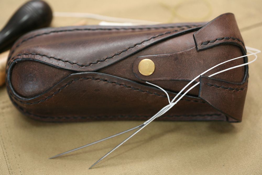 Dark Brown leather 2.0 mm with brown 1mm wax thread and brown Fiebing’s Edge Kote along with gold Metal Button snaps press Stud. Hand punched & sewn with burnished and waxed edges. Free glass cloth included.