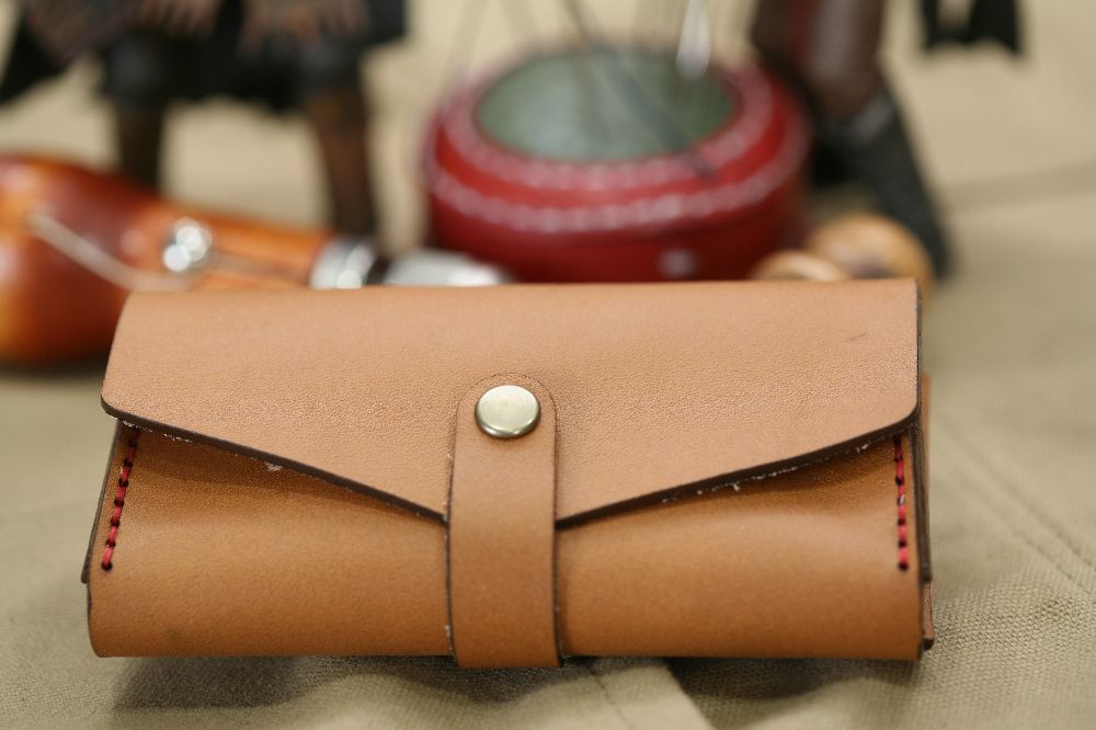 A simple one slot design with space for more than 10 business cards, credit cards and/or folded currency notes. Camel brown leather 1.40mm thick with 0.80mm red wax thread stitching and brown Fiebing’s Edge Kote. Brass metal snap press button stud. Hand punched & sewn with burnished and waxed edges.